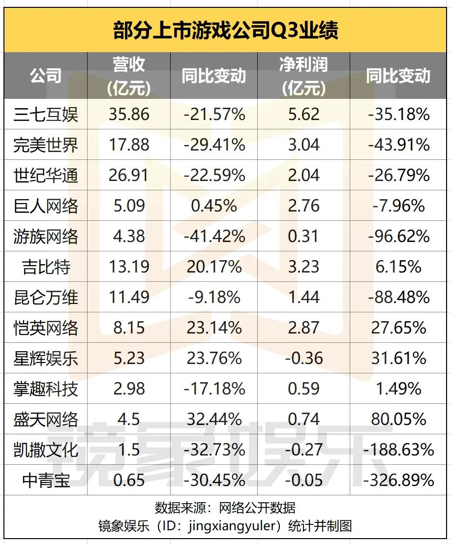 近日,A股上市遊戲公司陸續發佈了三季度財務報告,單從業績表現來看,多家公司都出現了同比下滑的態勢。在鏡象娛樂統計的13家A股上市遊戲公司中,包括三七互娛、完美世界、世紀華通、遊族網絡等在內的8家公司營收和淨利潤同比下滑。