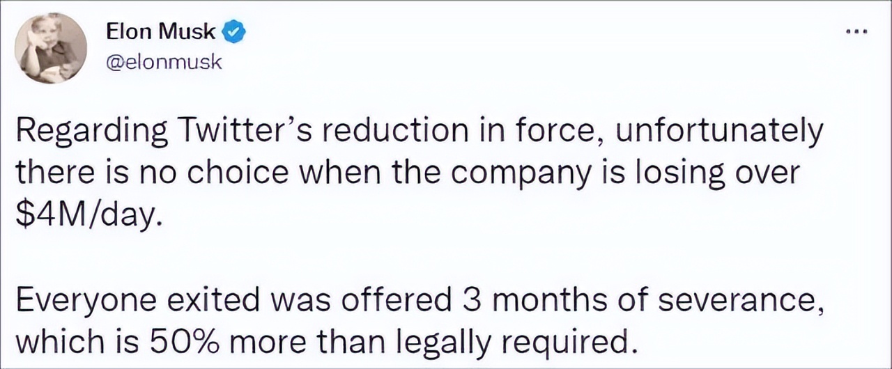 馬斯克在推特中寫道:“關於推特公司裁員,不幸的是,當公司每天虧損超過400萬美元(約合人民幣2874萬元)時,這別無選擇。每個離開的人都得到了3個月的遣散費,這比法律要求的高出50%。”