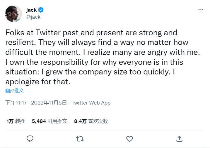 “從過去到現在,推特員工一直都很堅強。無論有多困難,他們總會找到辦法。”多爾西在推特上寫道。“我知道很多人對我很生氣。我對大家如今的處境負有責任:是我讓公司擴張得太快了。我為此道歉。”