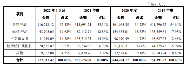 從招股説明書可見,從2019年度至今,傳統音箱產品仍是通力股份的主要營收來源,佔比超過一半,而AloT產品(人工智能物聯網)以及可穿戴設備的佔比合計保持在30%以上,增長較為緩慢。