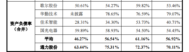 另一方面,通力股份相對較弱的產品競爭力背後卻有着高於行業平均的資產負債率: