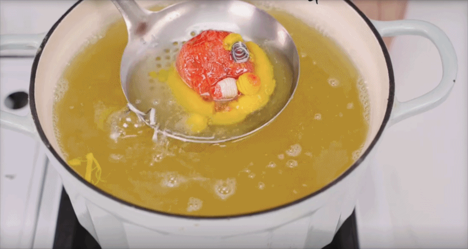炸好的荷花酥在油中瓣瓣綻放,如同魔術一般。