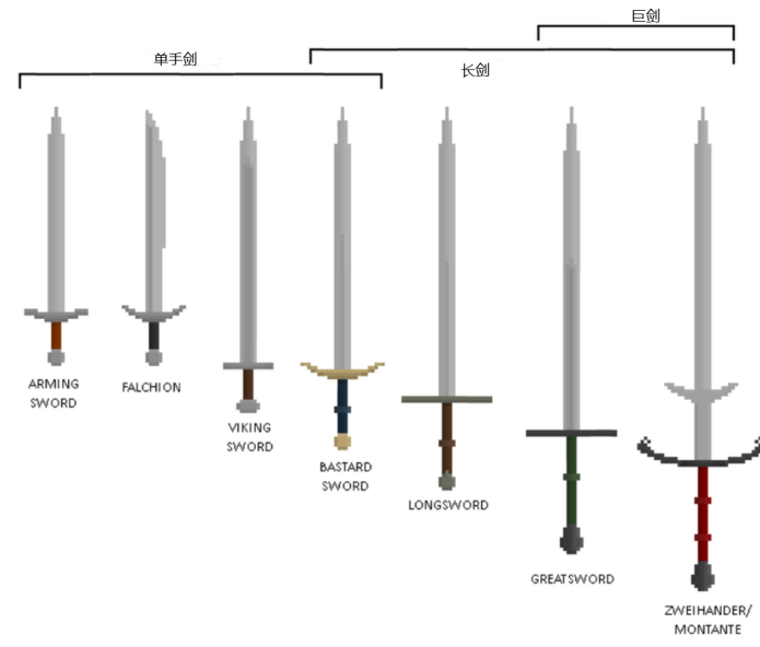 至於其他劍種則問題不大,長劍、單手劍、混種劍都是戰場上樸實可靠的兵刃,在遊戲世界裏也很受歡迎。唯一的小bug在於定義,遊戲中的長劍幾乎被默認為單手劍(很多時候會配個盾牌),歷史上的長劍(longsword)主要還是以雙手使用為主。是否為單手劍,實際上和劍身的長度無關,而是看劍柄的長度是不是隻有一手。現實中真正的長劍並不符合這個標準,所以我們在遊戲中看到的大部分“長劍”其實是混種劍(Bastard Sword)或者維京劍(後來演變為騎士劍和武裝劍)。