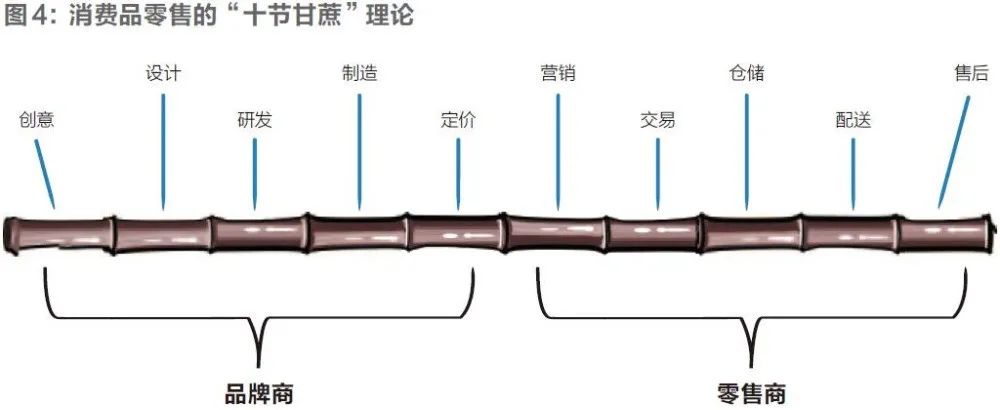 與其他很多企業不同,早在2014年,京東就曾提出了“十節甘蔗”理論,即零售、消費品行業的價值鏈分為創意、設計、研發、製造、定價、營銷、交易、倉儲、配送、售後等十個環節。