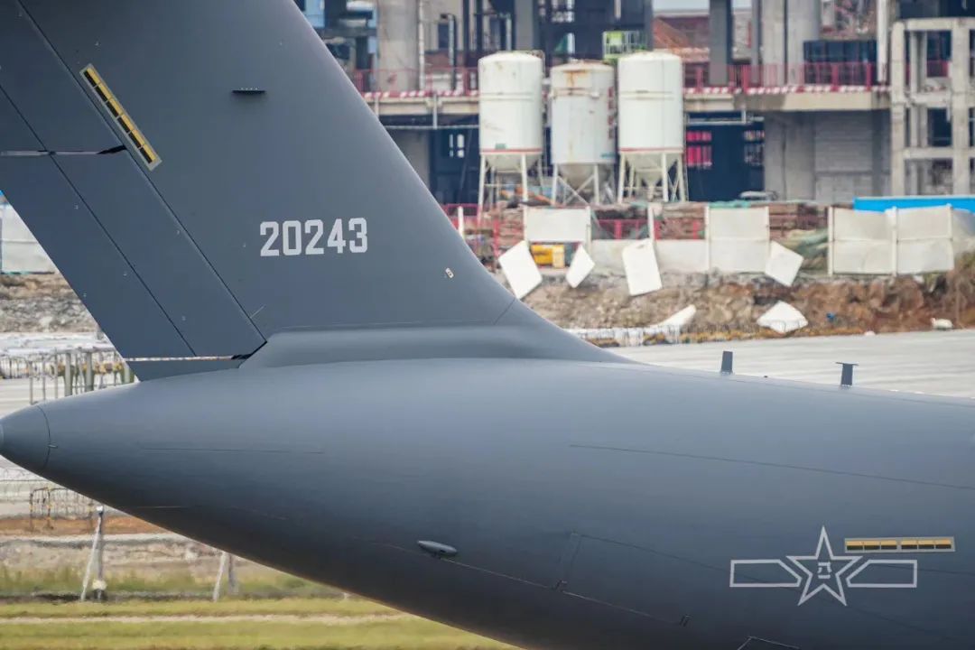 本架運-20 採用瞭解放軍空軍最新的低可視度塗裝。所謂低可視度塗裝,就是從實戰出發,儘量提升目視隱身性能的塗裝方案。表現在這架運-20 上我們可以看到,它的八一軍徽、中國空軍標識、飛機編號均採用灰色。