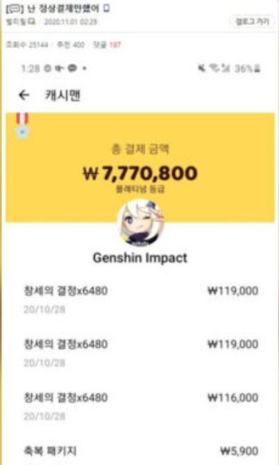 2020年原神哥第一次拿下世界冠軍當晚,粉絲們就發現他在《原神》上氪金770萬韓元,摺合約5萬人民幣。