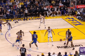 勇士上線對球,只有維金斯能擋一擋,他下去,勇士外圍一突就透。