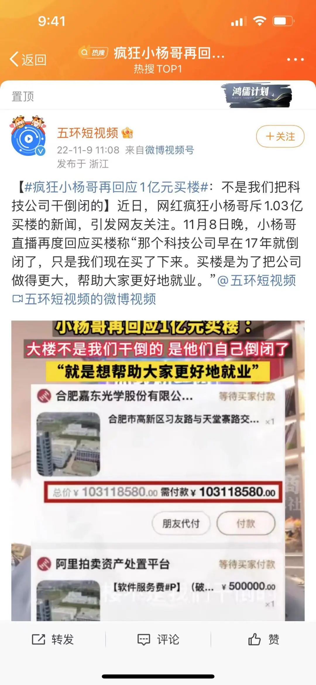以又慫又愛玩等人設、劇情,圈粉的小楊哥,在粉絲破億後,他又自己花了一億多元人民幣在合肥購置了一處房產,用來當作“三隻羊”公司全球總部(“三隻羊”為瘋狂的小楊哥所簽約的MCN機構)。