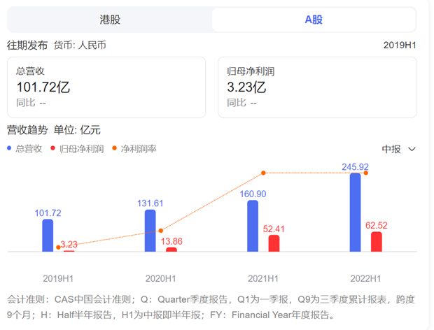 下圖是中芯國際的半年營收,2019年上半年為101.72億元人民幣,今年上半年變成了245.92億人民幣,歸母淨利潤2019年上半年還只有3.23億人民幣,到2022年上半年竟然變成了62.52億人民幣,出現了一二十倍的增長。