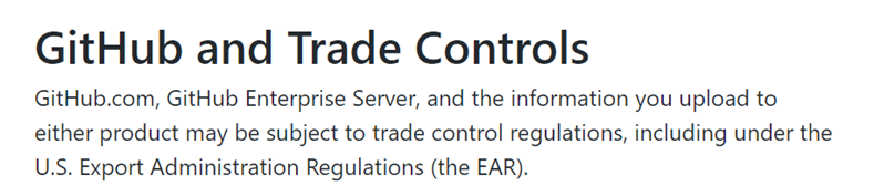 在全球最大的開源代碼託管平台Github的官網上面,在GitHub and Trade Controls(貿易控制)頁面,就明確的寫了GitHub提供的服務,以及上傳的代碼都可能受到貿易控制規定的限制,包括美國出口管制條例EAR。