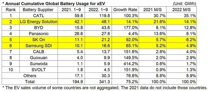 2022年1-9月全球動力電池廠商市佔率排名 圖片來源:SNE Research