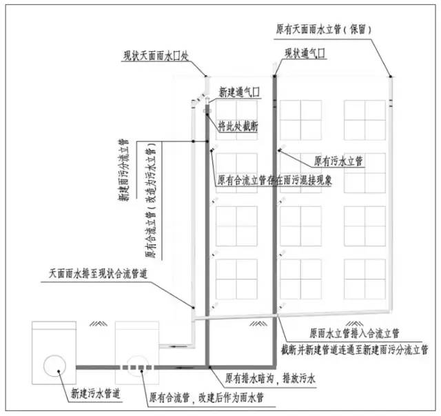 就是雨水從屋頂排入地下排水管道的過程中,和衞生間、廚房相連,和污水一起流入合流管渠,最後進入大市政污水管或者河流管道