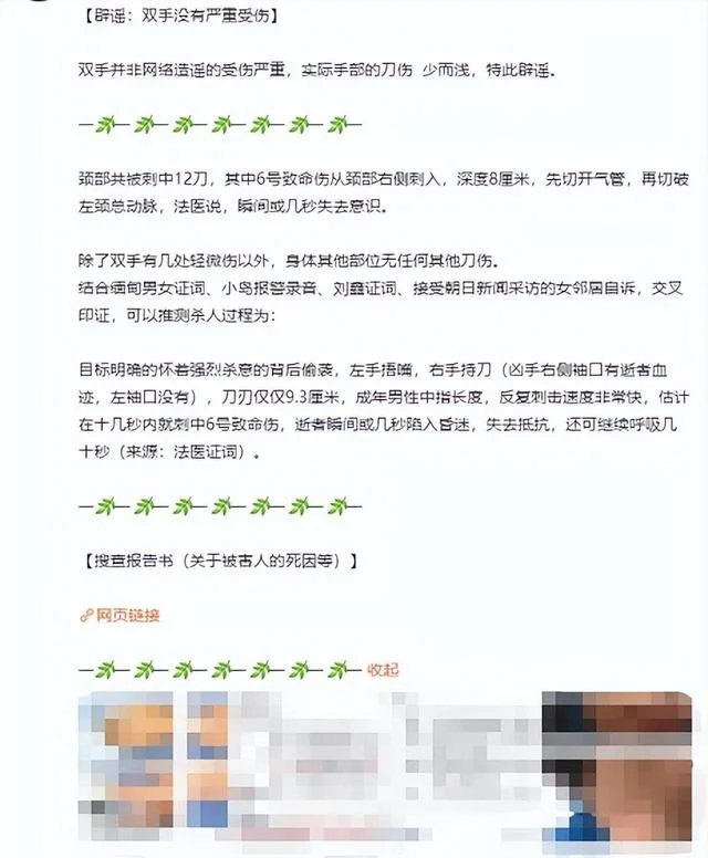 近日,江歌母親江秋蓮發現,有網友在社交平台發佈疑似江歌遺體局部的照片,並配文:“闢謠:雙手沒有嚴重受傷。雙手並非網絡造謠的受傷嚴重,實際手部的刀傷少而淺,特此闢謠。”照片包括江歌雙手的受傷情況、江歌頸部創傷情況等。