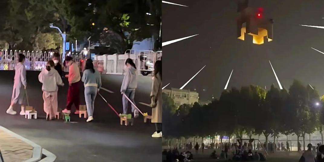 大學生們在校園裏“遛狗”、操場上出現“飛狗”。圖片源自網絡