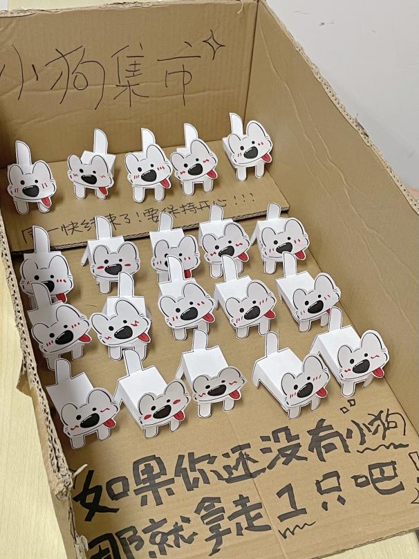 孫令桐利用A4紙、雙面膠和水彩筆做了20只紙盒小狗,又用廢棄的快遞紙箱做了簡易“狗窩”,整個製作過程花了4個小時。晚上,她把這窩“小狗”放到了學校逸夫樓樓下。“看到大家原本都面無表情,走過看到後都笑了出來,有的同學還掏出手機拍照,輕輕拿走一隻小狗。簡單的摺紙能給疲憊一天的同學帶來快樂,讓我覺得超開心!”