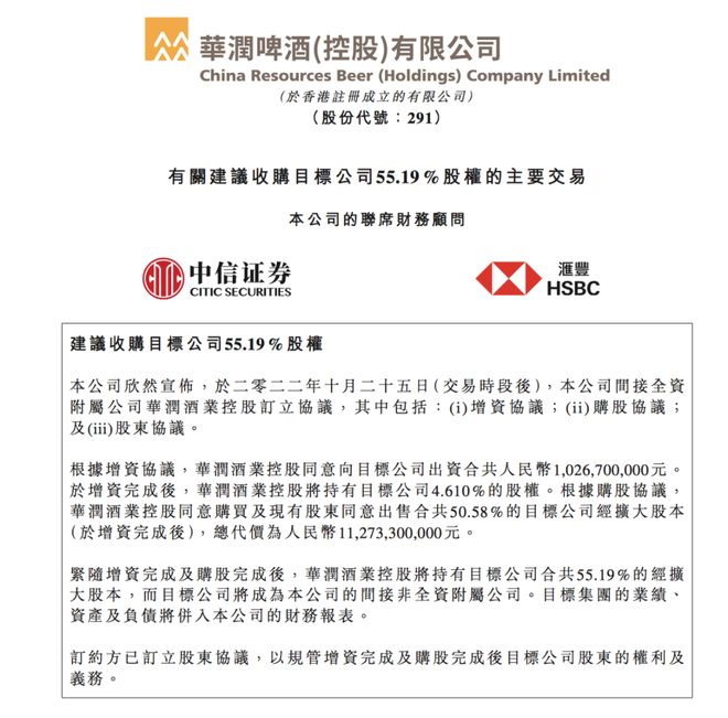 10月25日晚間,華潤集團旗下再添一員。當晚,華潤啤酒發佈公告稱,其間接全資附屬公司華潤酒業控股有限公司同意收購金沙酒業55.19%的股權。