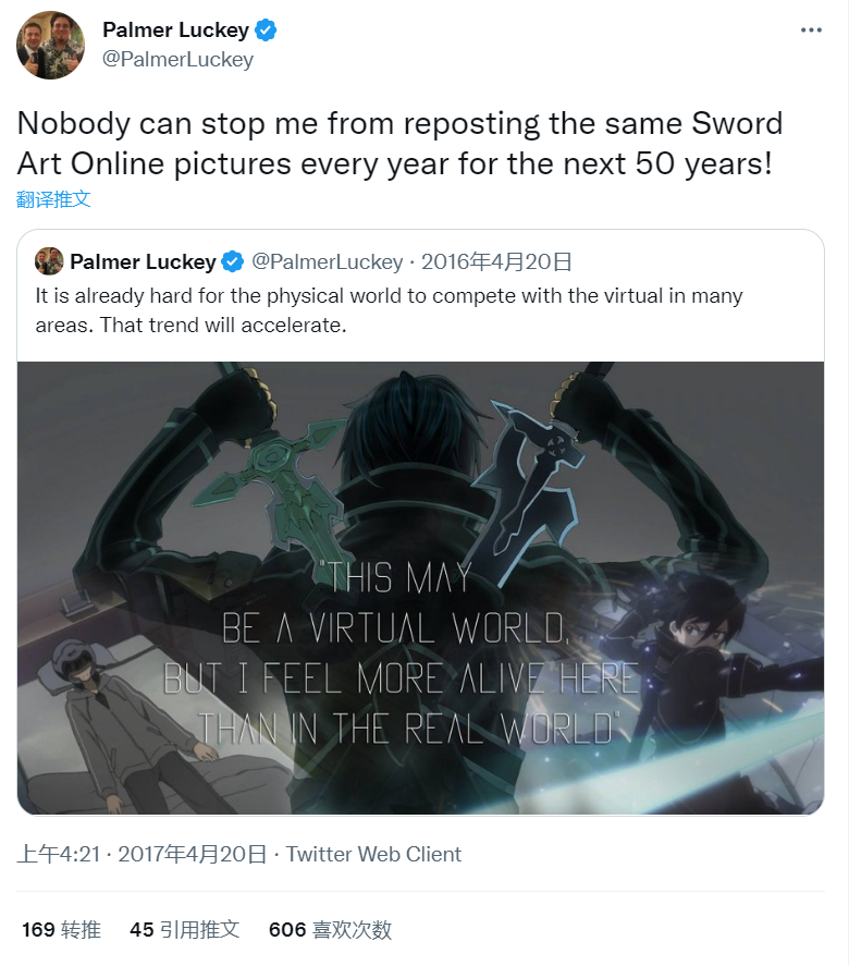 VR設備研發公司Oculus的創始人帕爾默·拉奇就總將SAO掛在嘴邊,他多次提到正是SAO的流行幫助Oculus獲得了最初的成功,這家公司生產的Quest2則是目前佔據全球VR設備銷量近九成的龍頭產品。