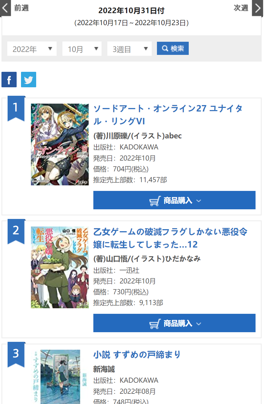 就在2022年的此時此刻,發售不久的《刀劍神域》第27卷仍是日本10月份輕小説銷量榜首。