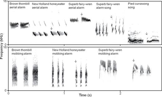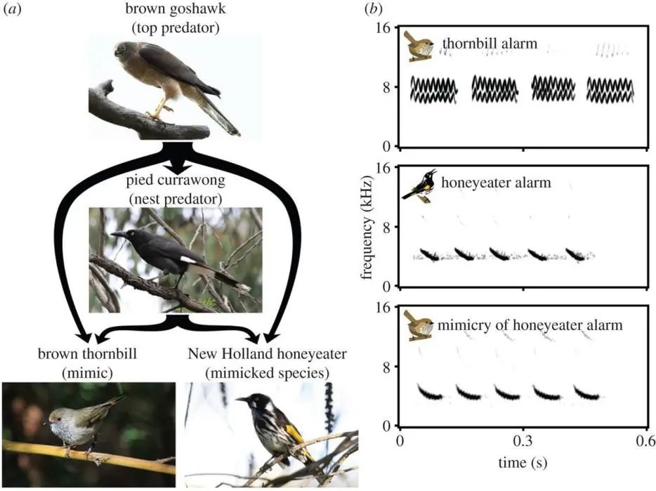 四個物種間的捕食關係以及褐刺嘴鶯和黃翅澳蜜鳥的警報鳴叫。圖片來源:參考文獻