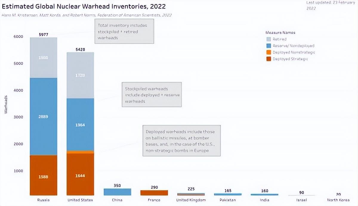雖然美方一再宣揚中國“核威脅”,但在這背後自身所擁有的核彈數量卻遠超中國。原子科學家公報和美國科學家聯盟年初聯合公佈的數據顯示,現階段全球共有9個國家擁有核彈,核彈頭數量約為12700枚,但這其中大約90%為俄羅斯和美國所有。雖然俄羅斯佔據榜首,但美國與其相比不相上下,數據顯示,美已部署戰略核彈頭數量為1644枚,非戰略核彈頭100枚,未部署核彈頭1964枚,儲備彈頭3708枚,總數相加達到了5428枚。