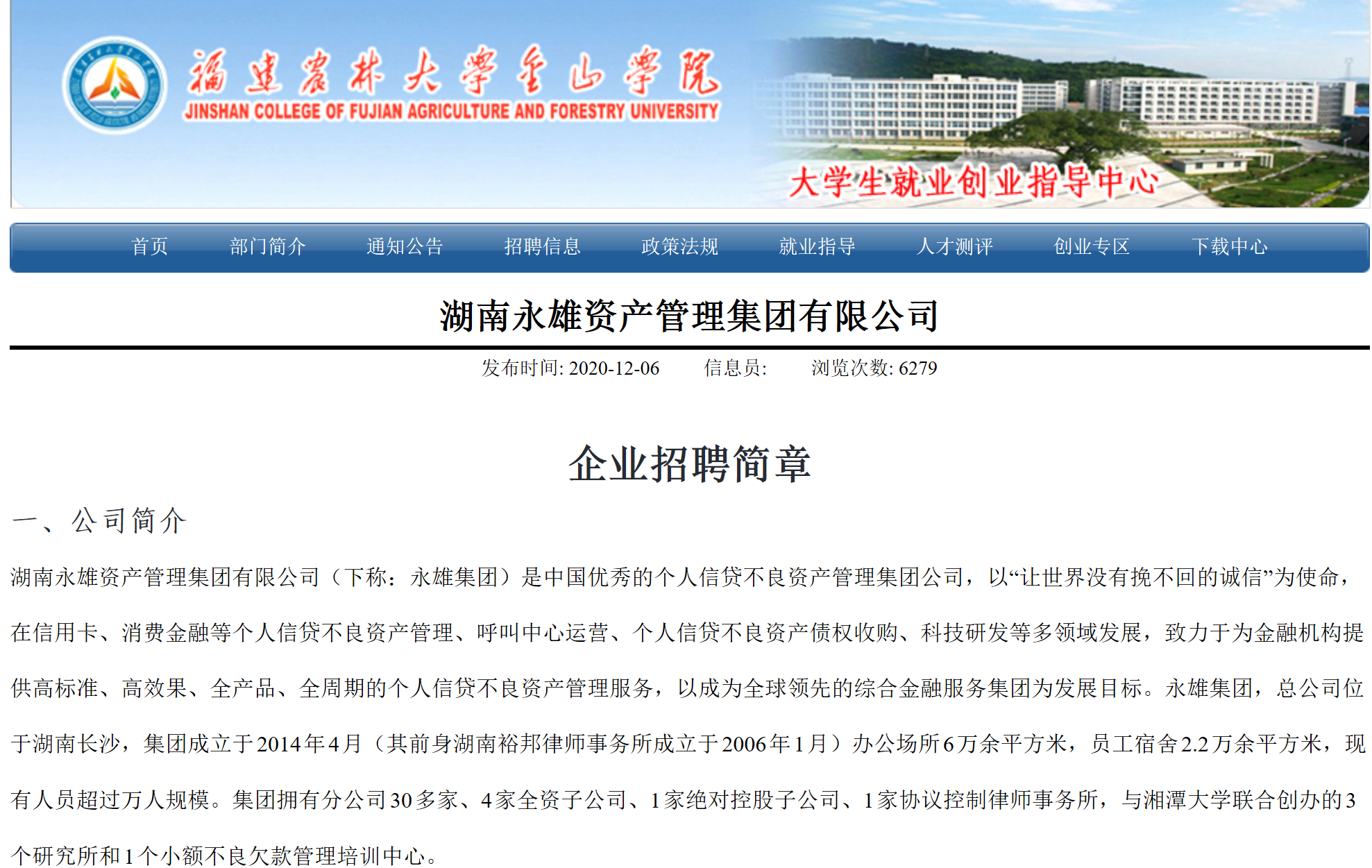 在百度檢索,還能發現永雄在全國很多高校的招聘公告。在福建農林大學官網,永雄的招聘簡章寫道,永雄集團是中國優秀的個人信貸不良資產管理集團公司,以“讓世界沒有挽不回的誠信”為使命,公司業務主要有信用卡、消費金融等個人信貸不良資產管理、個人信貸不良資產債權收購、科技研發等。對,你沒看錯,科技研發也是他們的主要業務。