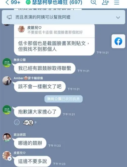 根據徐巧芯公佈的綠營側翼LINE羣組對話截圖顯示,有人提到“低卡那個也是截圖臉書某則貼文,但我找不到那個人”。無良公關聲稱“我已經有跟競辦取得聯繫”、“抱歉讓大家擔心了”,有人問説“哪邊的競辦”,旁人提醒“這邊不要多説”。