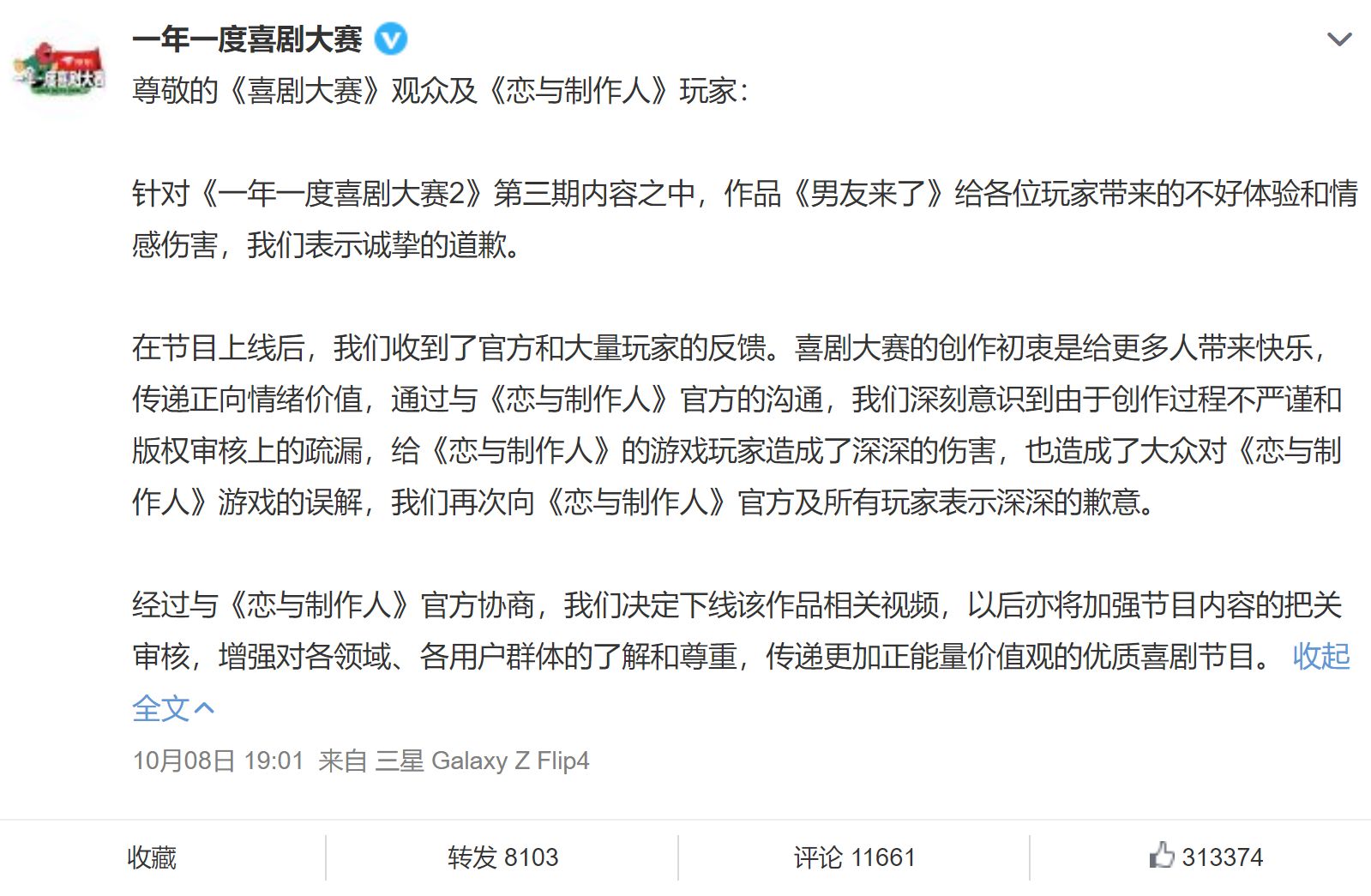 其實,《一年一度喜劇大賽》第二季剛播出不久,就已經出現了某作品因涉嫌侵權而下線的負面事件,節目組也在官方微博作出了真誠道歉。