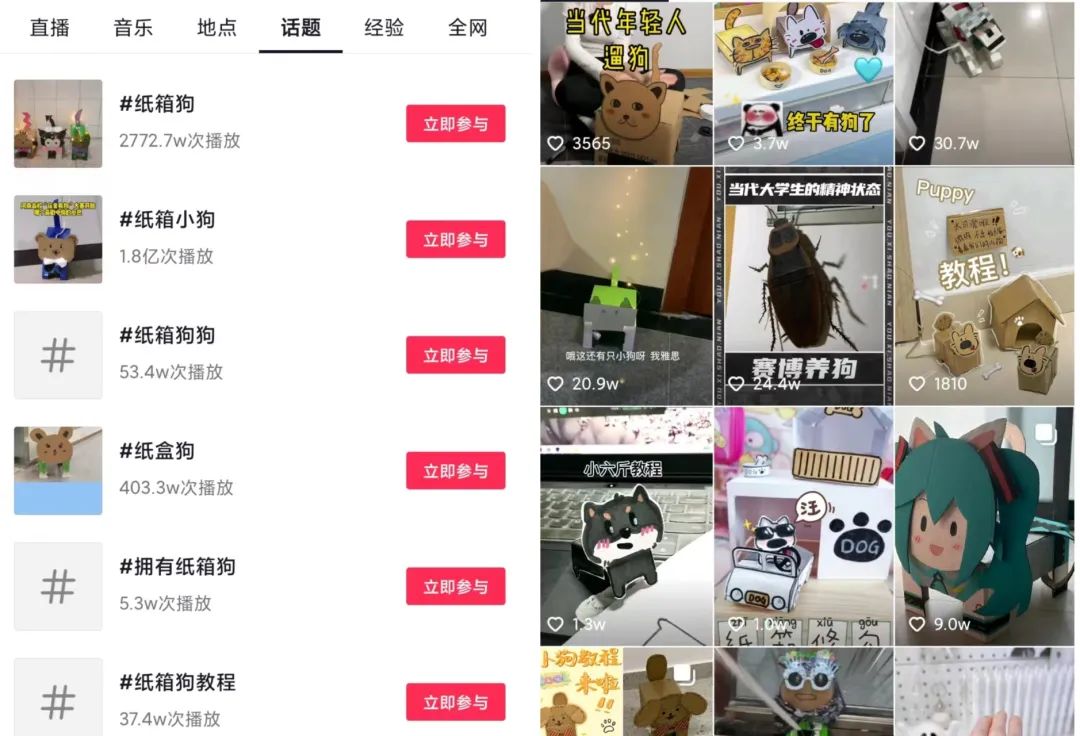 抖音上“紙箱狗”相關話題播放量已經超過2億次,不少人在小紅書上發圖配文,“有狗了,已經不想和沒狗的人説話了。”