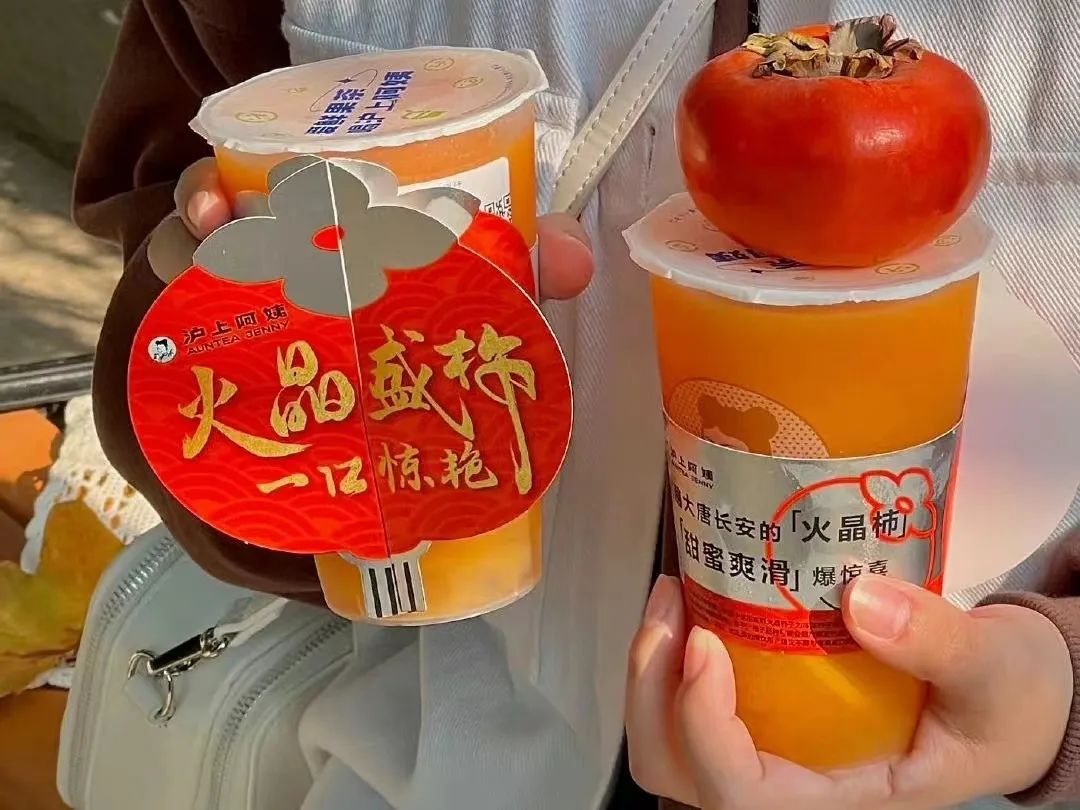 最近,滬上阿姨推出了柿子新品,土味杯套十分引人注意,燈籠形狀的杯套上,用誇張的廣告體印上“火晶盛柿”四個字,很是出圈,不少網友調侃,“好土好喜歡”。
