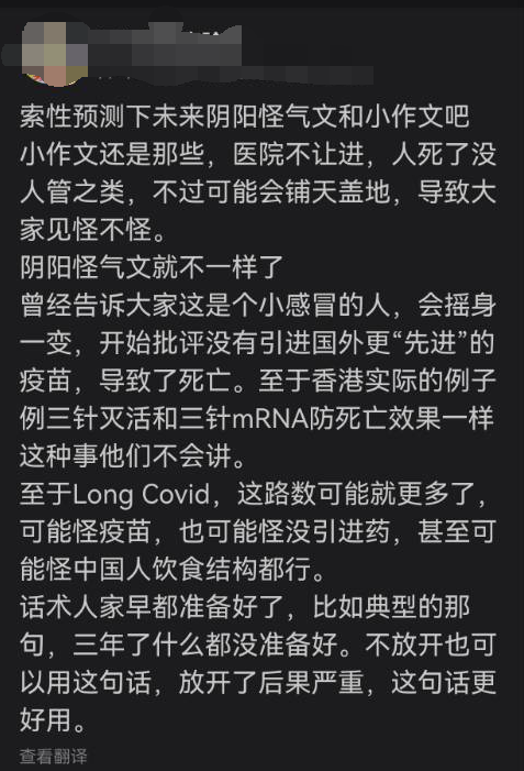 世界上沒有沒代價的東西。西方各國面對疫情的投入,靠的是開印鈔機和加税,中國靠的是工業生產,財政投入和組織動員力,來保障一套免費的治療,檢測,隔離系統,以世界唯一的組織能力硬頂三年,贏得了保貴的空間和時間和生命。但世界疫情得不到根本好轉,技術遲遲沒有決定突破,而不論內外又有大量人鼓吹共存。如果我們最終被拖下水,那不光是對每個人,對整個現代文明史來説,也是一件很可悲的事情。