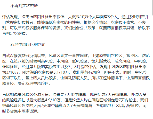 據國家疾控局發佈的信息。經過第九版的實踐及7、8月間的評估,發現中風險區的陽性檢出率為3/10萬,次密接是3.1/10萬;高風險區外溢人員4.9/10萬。這是取消中風險區及次密接人員管控,將高風險區外溢人員的集中隔離改為居家隔離的數據支撐。