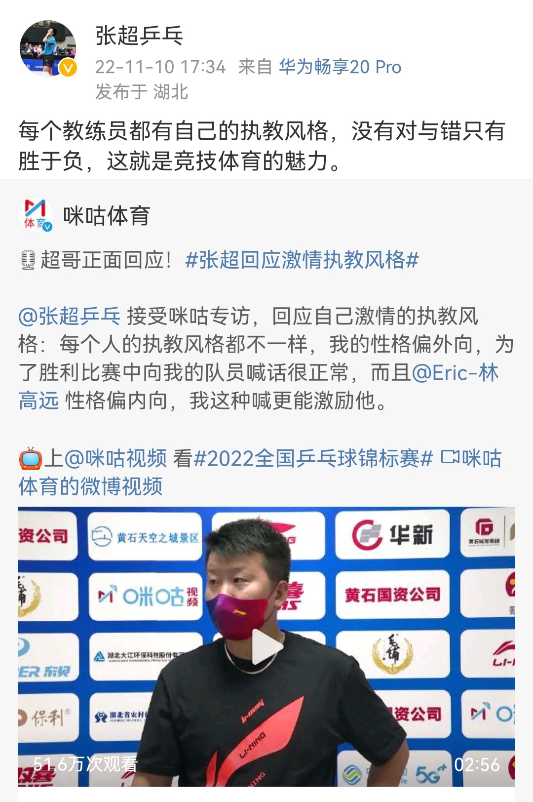 11月12日,乒乓球運動員林高遠的主管教練#張超#登上微博熱搜。