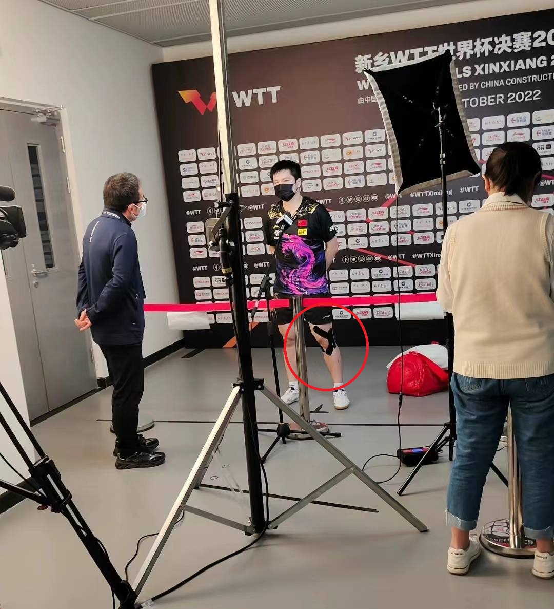此前舉行的WTT世界盃,樊振東受訪,可以看出其左腿膝蓋周圍被纏上了繃帶