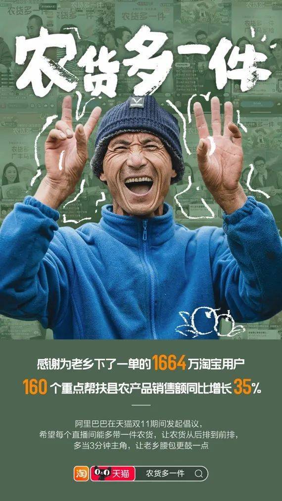 此外,今年天貓“雙11”還發起了“農貨多一件”倡議,希望每個淘寶直播間多帶一件農貨,這給了農產品當“雙11”主角的機會,也帶動了農產品的上行。