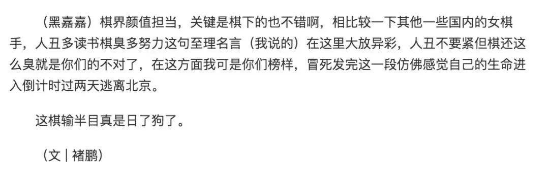 柯潔也是這類偏見的集大成者,藉着誇台灣選手黑嘉嘉漂亮的同時,內涵國內一些女棋手“人醜棋還臭”。