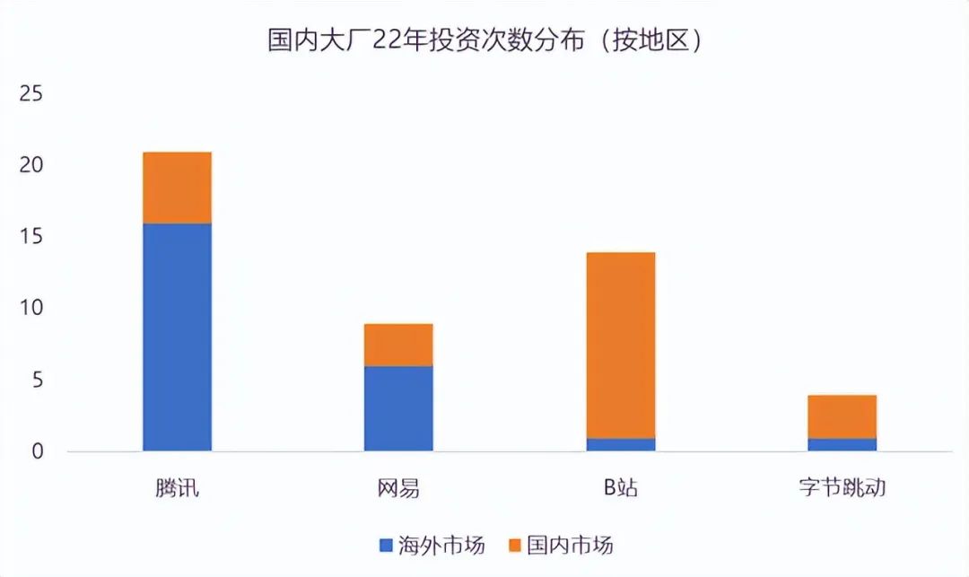 不過,騰訊、網易的全球遊戲佈局仍在有條不紊的進行當中,截止9月的數據,兩家公司在海外的投資筆數首次超過了國內投資,另外,B站、字節跳動等也有出手。