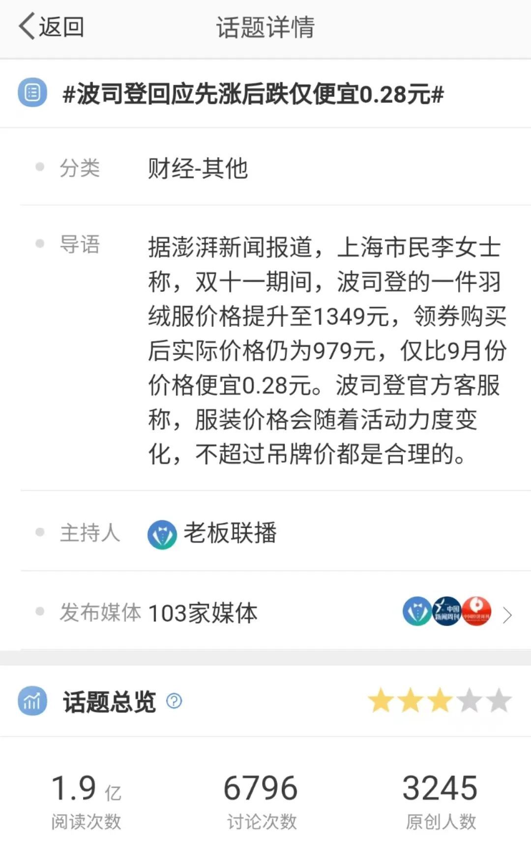 “波司登回應先漲後跌僅便宜0.28元"的話題很快成為熱搜話題,截至目前累計1.9億次閲讀,6796次討論。