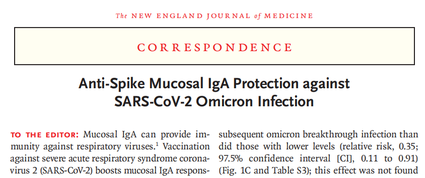 權威期刊NEJM在9月14日發表了一項瑞典團隊證明粘膜免疫能夠預防感染的重磅文章,其標題就是:抗S蛋白粘膜IgA抗體能預防奧密克戎感染。