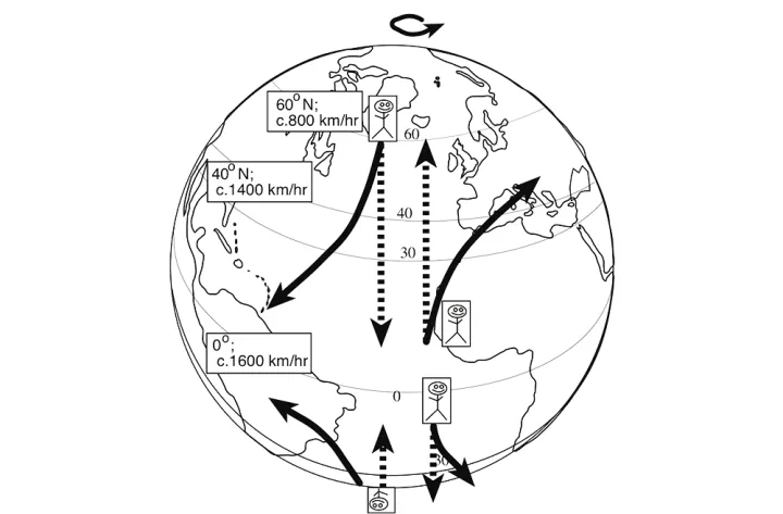 地球由西向東自轉,赤道的長度大約有四萬千米,而在兩極,緯線的長度卻是零。這意味着,更靠近赤道的陸地,比更靠近兩極的陸地轉動得更快。因此,以北半球為例,對於一架從赤道向正北方飛行的飛機,在引擎向北極方向施力的同時,飛機原有的運動會傾向於維持住它在更接近赤道時的那個較快的速度,結果就是,在地面上的人看來,飛機的運動軌跡並不是朝向正北方,而是偏轉向東方。類似地,從北極飛往赤道的飛機,在人們看來則會偏轉向西方。