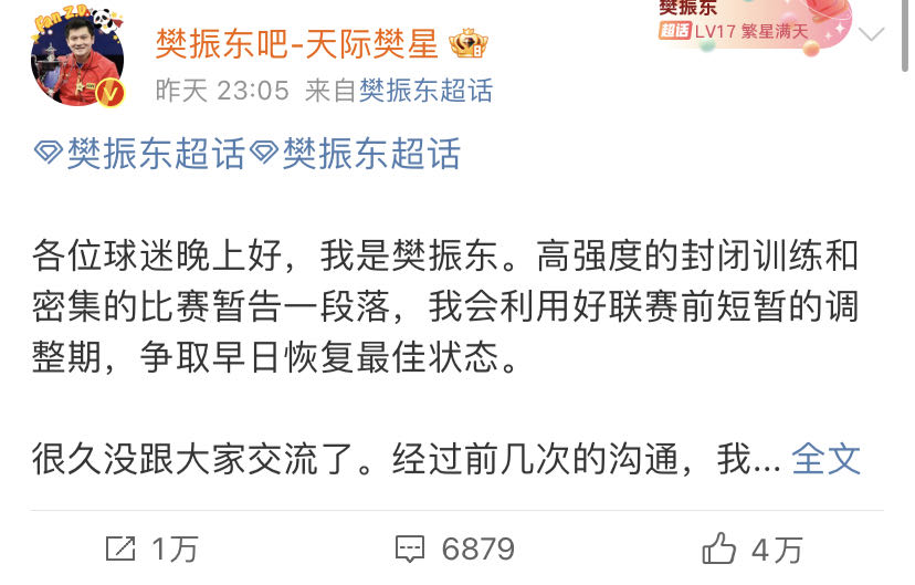 當晚,樊振東借@樊振東吧-天際樊星 發文,呼籲“不要把飯圈陋習帶進競技體育”。全文如下——