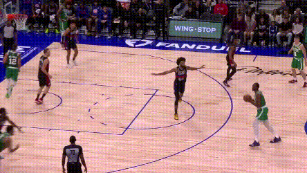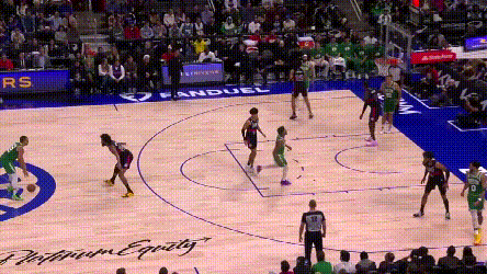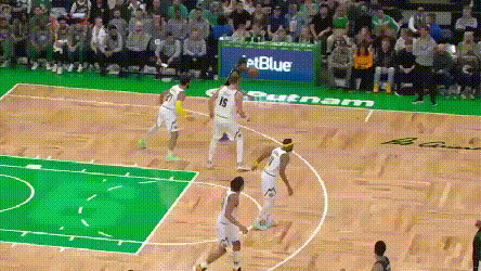 所有人都能投籃的好處就是,參與戰術時並不會拘泥於特定的角色,於是威脅產生的方向也就很難判斷。比如這次斯馬特的低位策應,霍福德弧頂給杰倫做完掩護後選擇了外拆三分。如果是勇士版本,不可能有這個方向的變化。