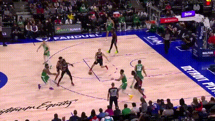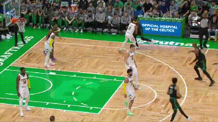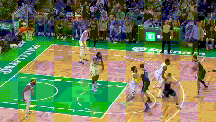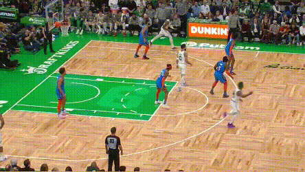 凱爾特人的進攻,在他們執行力在線時有一種簡約美,他們的戰術覆蓋率不低,一打四看的靜態場面不多(偶爾也有,比如與雷霆的一、二、三節末,也是他們打得差的時段),但卻不需要過於複雜的起手式,一個梯次掩護或者牛角落位的外撤掩護,配合簡單的走位,就可以打出多種威脅。