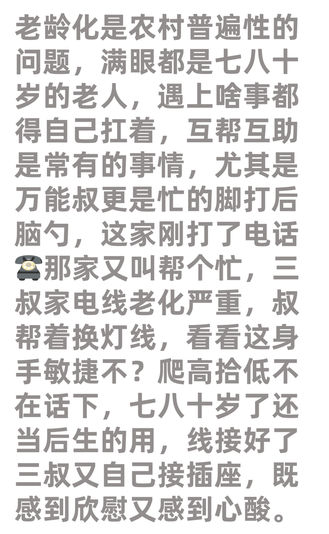 我視頻裏的嬸子大娘們,年輕時個個潑辣能幹,會因為孩子打鬧這類芝麻綠豆大的事情吵得雞飛狗跳,站在村口你來我往對戰。但現在,一個個老老實實坐在牆根,沒了往日的虎勁兒。畢竟她們除了彼此,也沒有其他人能陪伴。