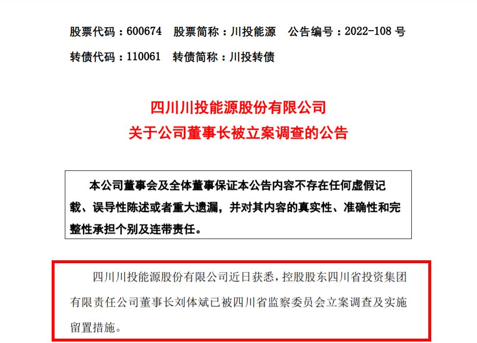 燈塔媒介11月17日訊,四川川投能源股份有限公司(簡稱“川投能源”,600674)16日晚發佈公告,公司近日獲悉,控股股東四川省投資集團有限責任公司(簡稱“川投集團”)董事長劉體斌已被四川省監察委員會立案調查及實施留置措施。