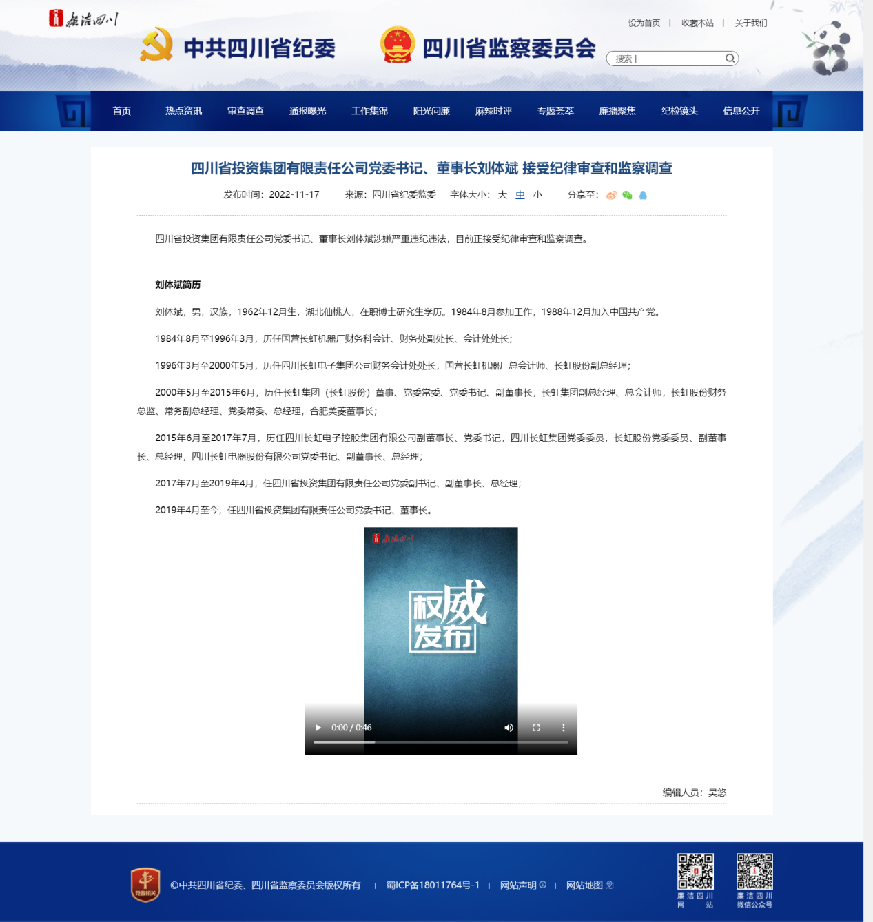 **11月17日,據四川省紀委監委網站消息:**四川省投資集團有限責任公司黨委書記、董事長劉體斌涉嫌嚴重違紀違法,目前正接受紀律審查和監察調查。