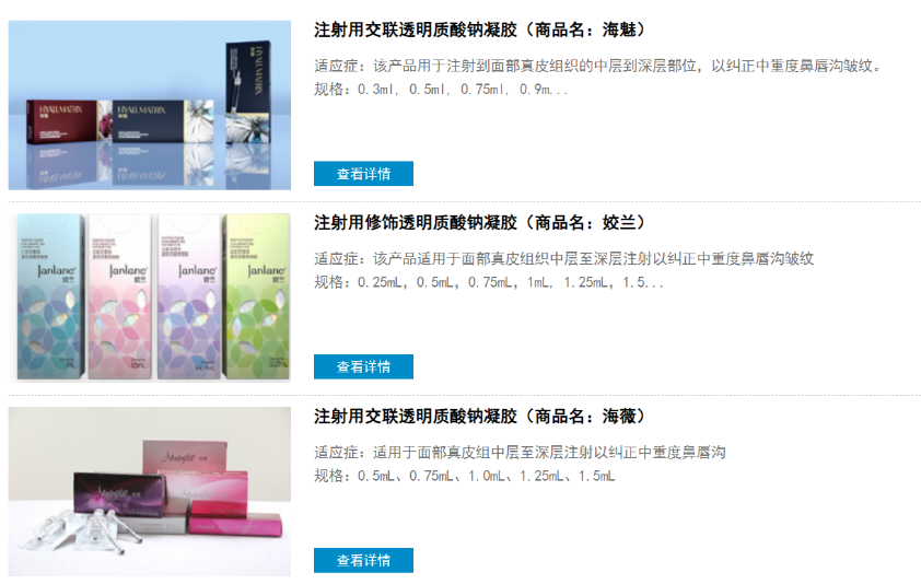 昊海生科的第一代玻尿酸產品“海薇”,是國內首個獲得國家藥監局批准的單相交聯注射用透明質酸鈉凝膠,定位大眾普及入門型,終端價格在500-1000元之間。隨後主打中高端的第二代玻尿酸產品“姣蘭”和主打高端第三代產品“海魅”分別於2017年和2020年上市。