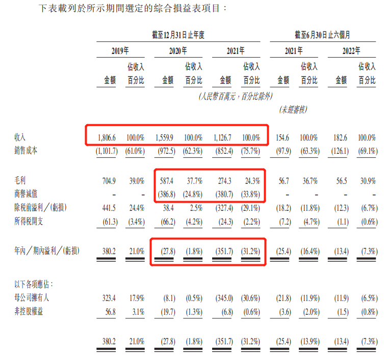 同一時期,公司的毛利從7.05億元跌至2.74億元,三年間下降幅度超過六成。而且,除了2019年盈利3.8億元,2020年-2021年公司分別淨虧損2780萬元、3.52億元。2022年上半年,公司淨虧損1340萬元,虧損之勢還未止住。