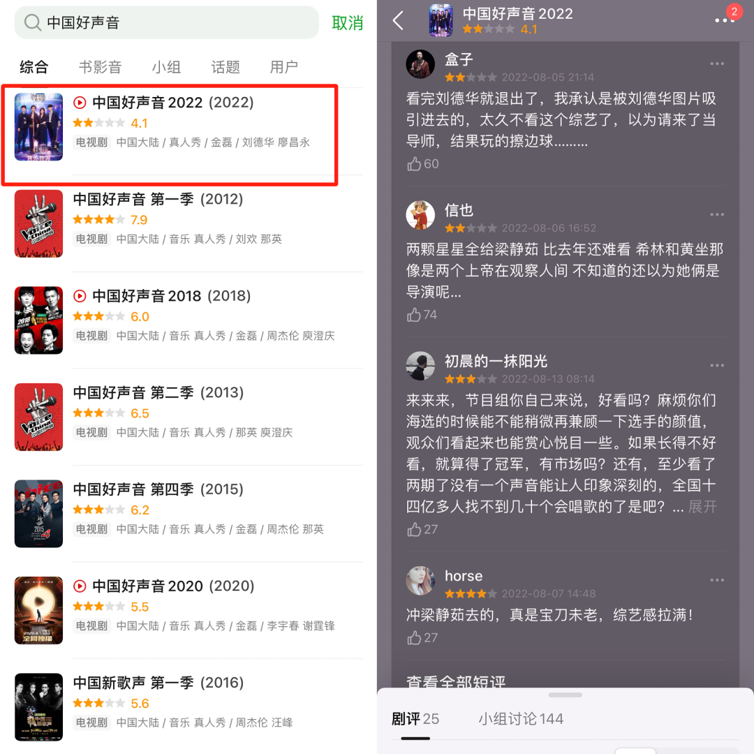 十年河東,十年河西,上市夢還未實現,作為星空華文上市最大的籌碼,《中國好聲音》頹勢日漸明顯。從豆瓣看,儘管珠玉在前,但近幾年《中國好聲音》的人氣和口碑依然下滑嚴重。尤其是今年開播的《中國好聲音2022》,請來了劉德華、梁靜茹等知名藝人背書,又配備了希林娜依·高、張碧晨等新星,開播之前賺足了關注目光。但開播後,豆瓣評分出現史上最低的4.1分,評論裏一片批評聲,集中在“黑幕”“廣告植入生硬”“難看”等。