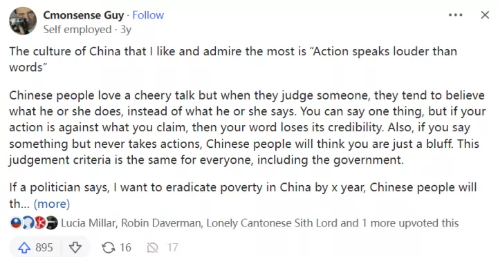 我認為這種文化來自於實用主義,這種實用主義在中國漫長的歷史中深深紮根於中國人心中。人們目睹了帝國和朝代的興衰,並得出結論,只有實際發生的事情才是重要的。意識形態和這個主義那個主義都聽起來不錯,但如果它們不能為人民帶來實際利益,它們就只是花言巧語。