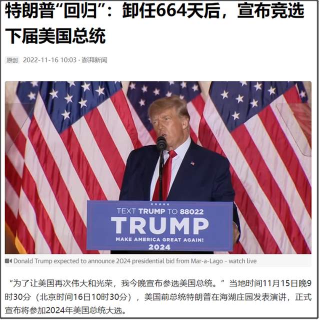 11月15日,特朗普正式宣佈加2024年美國總統大選。